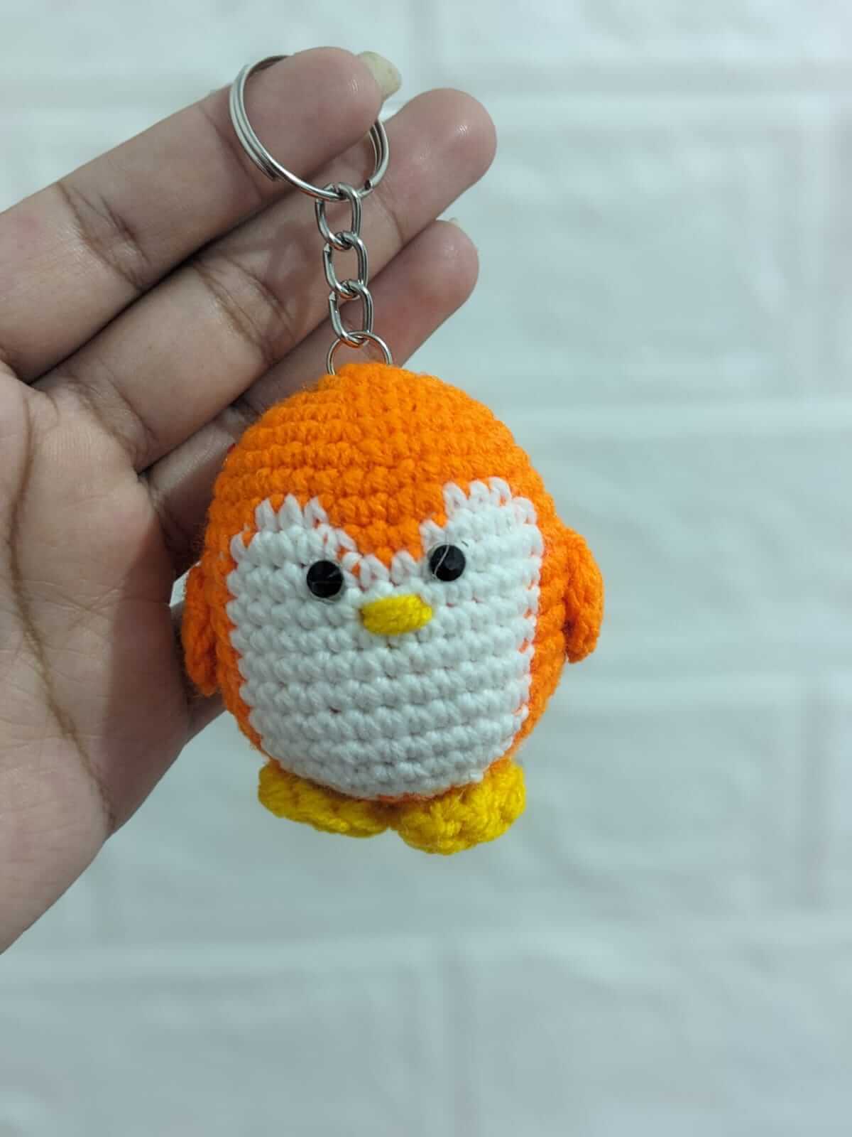 It features a cute penguin design, handmade with bright orange, white, and yellow yarn, and attached to a keyring. For your web page, a suitable name could be: